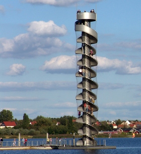 Die Krone der Stahlkonstruktion bildet die Aussichtsplattform. Je nach Pegelstand gleitet die Stahlkonstruktion am Dorn auf oder abwärts. Die gesamte Stahlkonstruktion des Pegelturms ist von einem feinen Stahlnetz umgeben, das die notwendige Sicherheit der Besucher beim Auf- und Abstieg gewährleistet.
